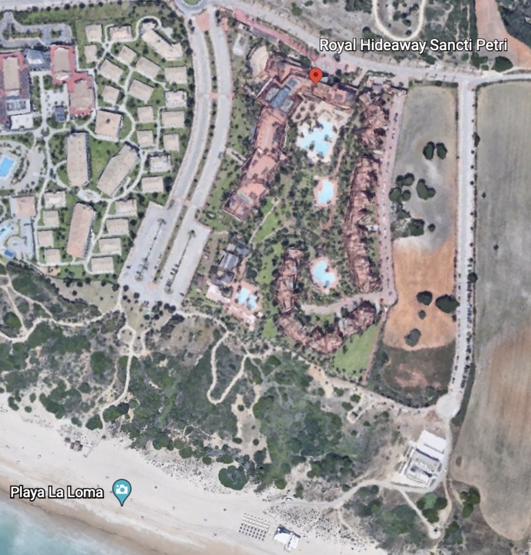 Above we can see the Royal Hideaway Sancti Petri on the left-hand side of the site, and on the right-hand side we can see the access road to the Aparthotel that occupies the same site. On the left we can see the open public parking that provides access to the public beach. One point worthing noting is that the hotel site is quite substantial and is set back from the beach, so the hotel main entrance is in fact about 600 metres from the sea (all slightly downhill).