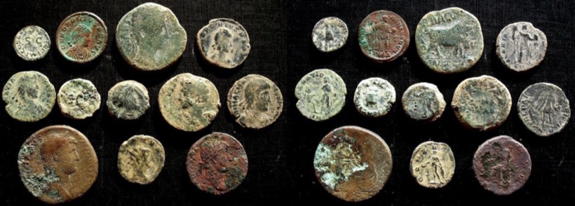 Below a collection of Roman coins covering the period Augustus (63 BC to 14 AD), Claudius (10 BC to 54 AD), Adrianus (113-193 AD), Gallienus (218-268 AD).