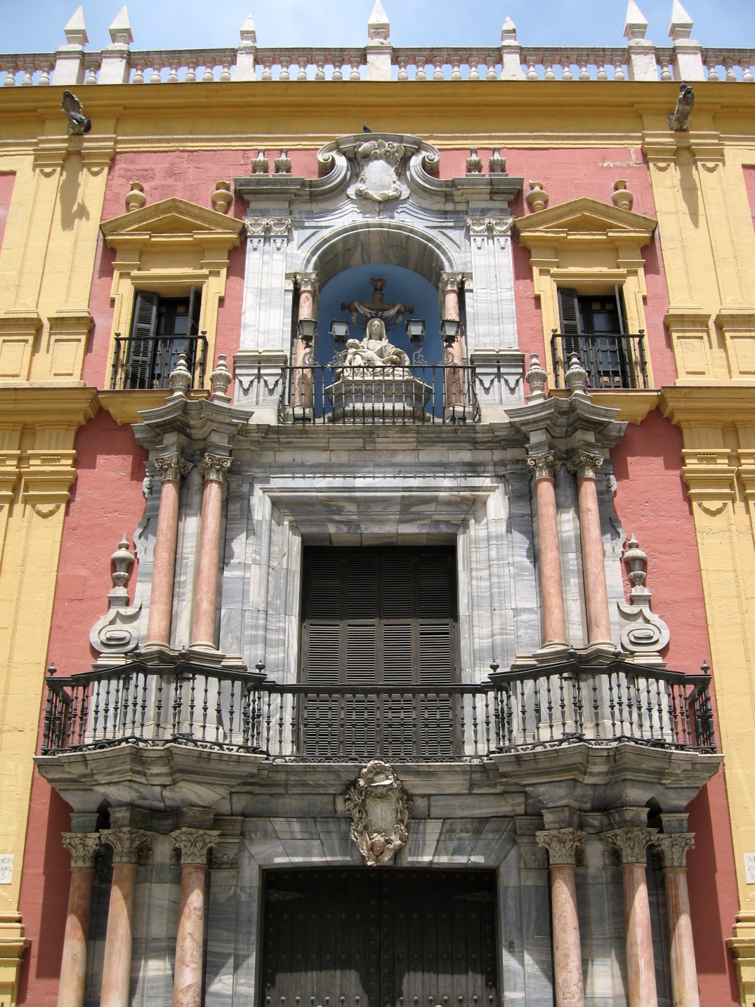 Stylistically, in the move from the 16th C to the 17th C, the Málaga city council wanted to preserve the formal unity of the original Cathedral architecture, allowing only subtle decorative changes to the vaults (more naturalistic forms had become fashionable). But the problem was that they constantly changed the architect, or should we say architect-sculptors. In 1722 the designs of the façade were reviewed by Vicente Acero y Arebo (ca. 1675-1739), another Spanish Baroque architect, and by Diego Antonio Díaz (1675-1748), yet another architect. The reality was (I think) that José de Bada y Navajas had already been working on drawings for the façade made by José Fernández de Ayala, a pupil of Pedro de Mena (1628-1688), who had carved the choir-stalls. So we now have a façade designed by five different architects covering a period in excess of 100 years. It is not surprising that the proposed “new” façade design was rejected for aesthetic reasons. In addition it would have cost too much, and was probably impossible to actually build. Vincente Acero y Arebo came back in 1724 with a modified design, in which another three different architects (I’ve given up naming them all) had added more Baroque ornamentation. The Málaga council was divided. Some considered the new design too “calm” and just a “pile of forms already known”, others thought it to be the ideal Renaissance façade. Today “experts” consider the façade good, but “dry” and lacking imagination. There is some truth in this, if we compare the Cathedral façade with the pink and yellow of the Palacio Espiscopal just next door.