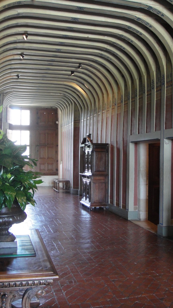 In France the stairs were usually spiral and placed in a corner tower, and it has been suggested that these stairs were the first built in France to the new Italian designs. For many experts these stairs are the most original innovation in the château. They claim that everything is to be admired. How the ribs in the vaulted roof intersect at right angles, how the groins are decorated with keystones, and how the coffers are decorated with human figures, fruits and flowers. I must admit that I quite liked the way the two banisters intersected on a landing forming a loggia with a balustrade. Very effective, since you have a view of the Cher and it lets light into the stair well.